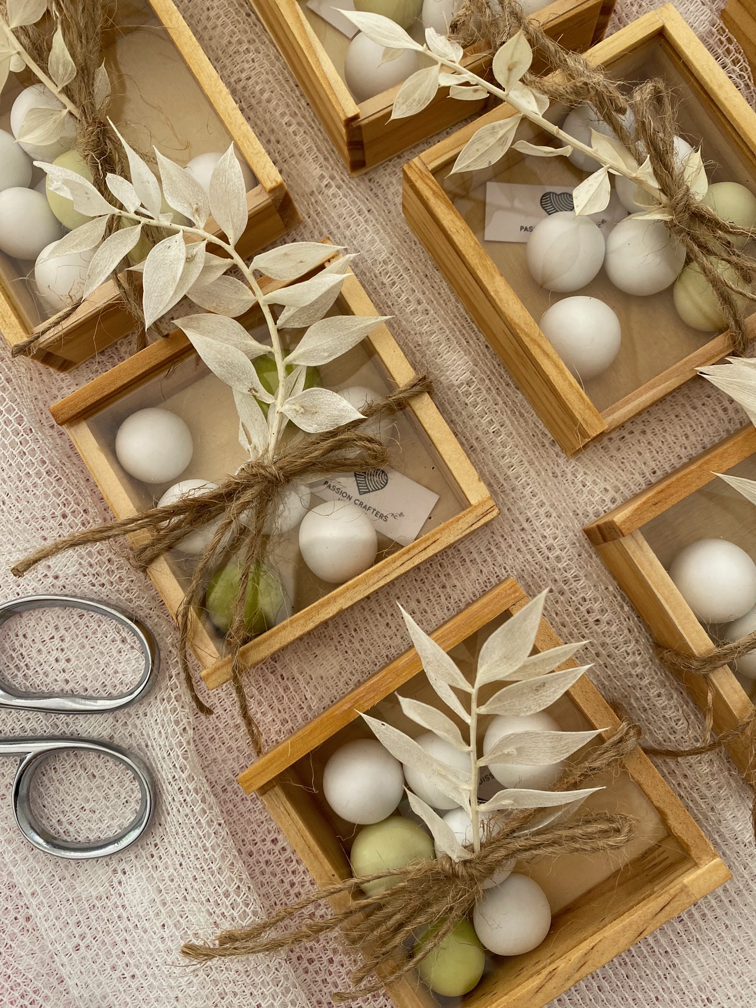 Σε στυλ μίνιμαλ και ρουστίκ, κάθε κουτί περιέχει 5 κουφέτα crispy Χατζηγιαννάκη. Είναι διακοσμημένα με αποξηραμένα λευκά φύλλα και δεμένα με σπάγκο.