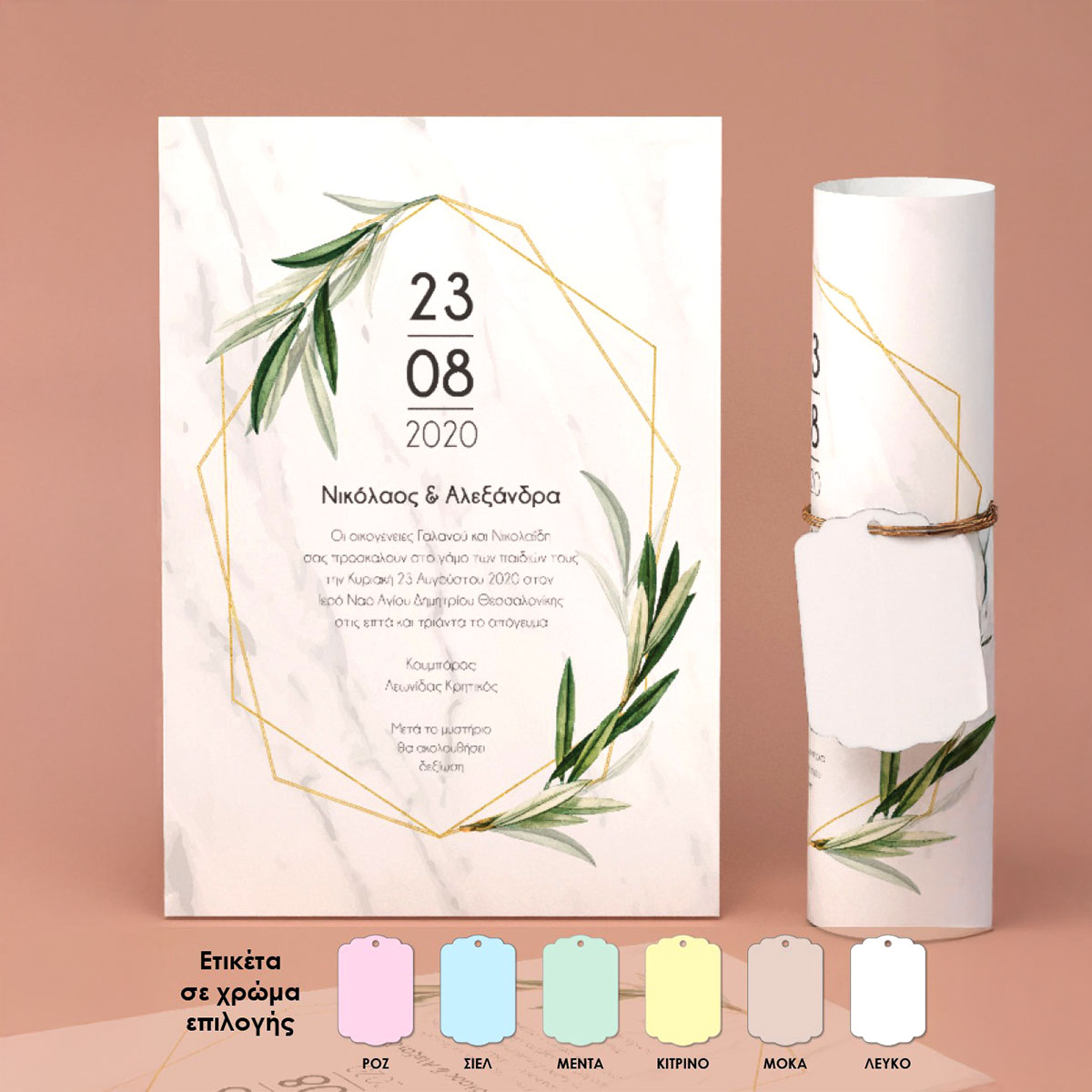 Προσκλητήριο γάμου, Ελιά και χρυσές λεπτομέρειες